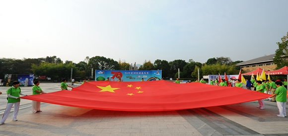9月29日一早的濱水公園,在8面紅旗和8面麗汽集團(tuán)司旗的簇?fù)硐拢?/span>16名旗手莊重地鋪展開(kāi)一面巨幅國(guó)旗。早早趕來(lái)的麗汽員工和在公園晨練的市民紛紛在國(guó)旗前拍照留念。那一抹鮮艷的中國(guó)紅,映照出的不僅是人們的笑臉,還有所有人心中對(duì)祖國(guó)的依戀。