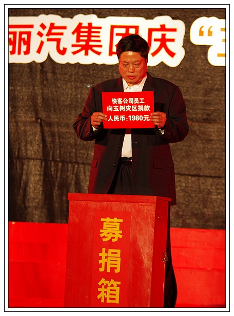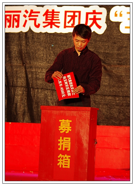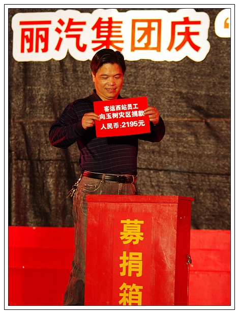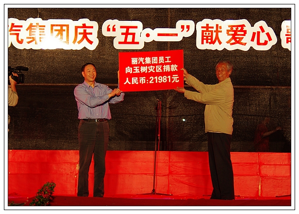 演唱會上,麗汽集團員工為玉樹地震災(zāi)區(qū)進行了捐款,所募集的21981元善款轉(zhuǎn)交市慈善總會。