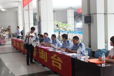 活動現(xiàn)場懸掛了安全生產(chǎn)宣傳標(biāo)語,設(shè)置了安全咨詢臺,并在候車室前廳、中廳等人員聚集的位置,放置了各類以安全為主題的宣傳版畫,圖文并茂的向旅客宣傳了防詐騙、交通、防恐等安全知識。在整個活動期間,到咨詢臺來現(xiàn)場咨詢的旅客絡(luò)繹不絕,各單位咨詢?nèi)藛T還向旅客發(fā)放了《平安交通 人人有責(zé)》、《警民相約 共建和諧》、《公民防范恐怖襲擊手冊》、《為防范與遏制“電信(網(wǎng)絡(luò))詐騙犯罪”致市民的一封信》等十余種安全生產(chǎn)宣傳資料共計(jì)2000余份,營造了安全生產(chǎn)月活動的良好氛圍。