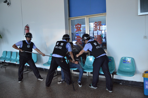 (科目二:反恐演練)一名青年男子在過安檢時(shí)被查出包內(nèi)攜帶一把管制刀具,安檢員上前檢查時(shí)該男子拒絕配合,同時(shí)揮舞起刀具往候車大廳逃跑。業(yè)務(wù)站值班人員立刻通過廣播通知旅客不要慌張,同時(shí)疏散遭受驚嚇的旅客。保衛(wèi)科立即報(bào)警,并向值班科長匯報(bào),保衛(wèi)科反恐應(yīng)急人員攜帶反恐器材火速趕到現(xiàn)場,大聲呼喝讓其放下刀具,一面盾牌迎面頂上,該男子被逼到墻角,另一位隊(duì)員用鋼叉迅速將目標(biāo)固定,趁其慌亂之際,防暴棍準(zhǔn)確的砸在男子手腕上,兇器應(yīng)聲掉落,另一名隊(duì)員一腳踢開刀具,三人合力,將兇徒控制住,扭送給趕到的公安民警。