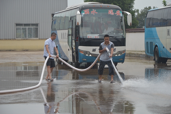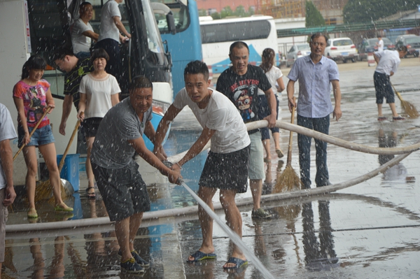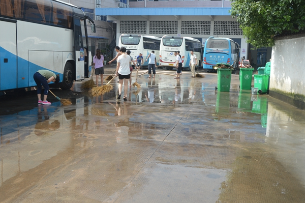 長運(yùn)公司修理車間、調(diào)度室等昨天也受到了重創(chuàng)。一大早,修理工師傅們?cè)缫涯闷鹚畼?,打掃修理車間;員工們開始沖洗辦公場地。