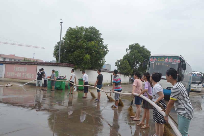 旅游集散的青年隊(duì)伍來了,經(jīng)理葉劍飛和員工們一道正起勁地沖洗著候車室。