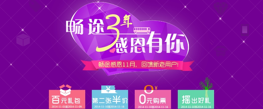 為了慶祝暢途網(wǎng)成立3周年,在11月份,暢途網(wǎng)推出了一整月的活動(dòng),有:11.3-11.9購(gòu)票送百元禮包,11.10-11.16第二張票半價(jià),11.17-11.23 0元購(gòu)票,11.24-11.30搖錢(qián)樹(shù)送好禮?;顒?dòng)多多,優(yōu)惠多多,讓大家在輕松享受購(gòu)票的同時(shí),帶給大家更多的實(shí)惠與樂(lè)趣!