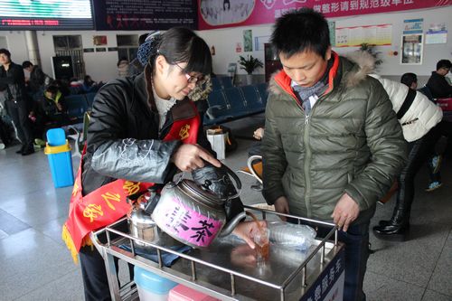 昨天進(jìn)入到大寒節(jié)氣,今天馬上就有一股冷空氣來(lái)應(yīng)景,氣溫有小幅的下降。一大早西站“流動(dòng)之家”服務(wù)班的崗員們就準(zhǔn)備好一大壺?zé)釟怛v騰的姜茶,免費(fèi)為候車大廳的旅客送上熱姜茶,幫助他們驅(qū)去寒意,溫暖回家的旅程。