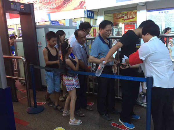 活動第一天,佩戴志愿者紅袖章的同志已經(jīng)穿梭在車站的各個角落,熱情的為來往旅客服務(wù)。在售票大廳,為旅客介紹客車的運行班次,引導幫助旅客使用自助售票機購票;在服務(wù)總臺,為未帶身份證的旅客辦理信息登記工作;在安檢口,積極督導旅客進行人物分離安檢,維持排隊秩序;在候車大廳,為旅客提供免費防暑涼茶,宣傳客車服務(wù);在長途班車檢票口,幫助不熟悉實名檢票的旅客順利檢票通過。