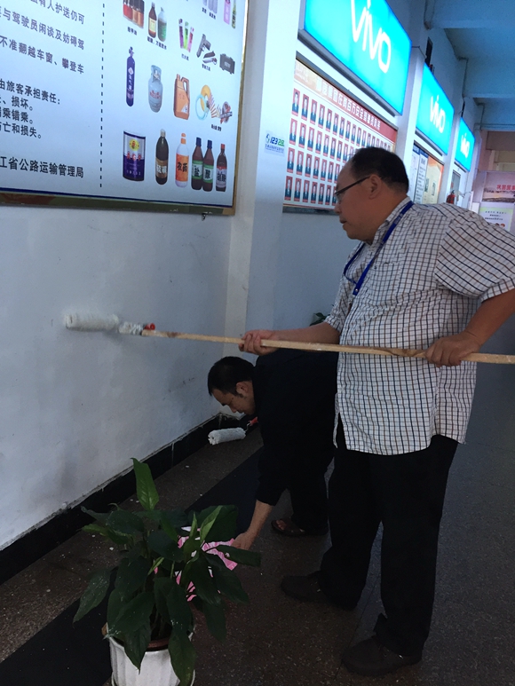 東站志愿者隊(duì)售票廳、候車廳、發(fā)車區(qū)墻壁進(jìn)行刷白