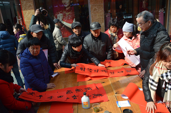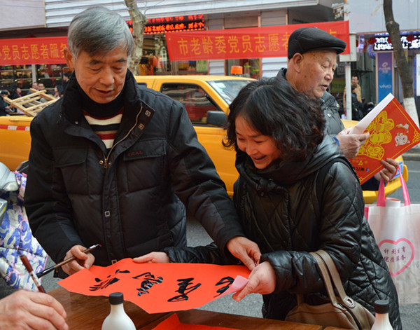 雖然時(shí)節(jié)已過立春,但農(nóng)歷臘月十九(2月7日)的早上還是寒意逼人,麗汽集團(tuán)的黨員們卻一早就來到中山街路段,面向廣大群眾展開了春節(jié)班車時(shí)刻咨詢、汽車銷售維修服務(wù)和送春聯(lián)、送福字三項(xiàng)服務(wù)。退休老黨員蘭延生、陳根松、王法根三人更是現(xiàn)場潑墨揮毫,冒著嚴(yán)寒為現(xiàn)場的群眾書寫春聯(lián),送去新春祝福。短短半天時(shí)間里,黨員們共發(fā)放春運(yùn)班車時(shí)刻表、汽車銷售維修資料500份,解答咨詢76人次,贈(zèng)送福字1800張,為群眾現(xiàn)場書寫春聯(lián)450幅,惠及群眾1500人次。