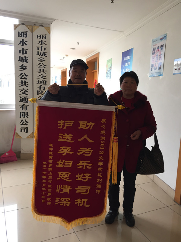 2月23日,麗水市城鄉(xiāng)公交公司的辦公室來了一對(duì)樸實(shí)的夫婦,他們拿著一面印有“護(hù)送孕婦恩情深,助人為樂好司機(jī)”字樣的錦旗,指明要送給501路公交車司機(jī)劉海偉:“多虧了劉師傅幫忙,我兒媳婦才平安生下了大胖小子!”