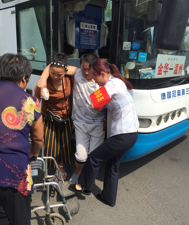 9:35金華到麗水的班車緩緩地駛進了高鐵配載點。車一停穩(wěn),旅客們便陸陸續(xù)續(xù)的下車前往下一個目的地。眼尖的江旭紅看見一位中年婦女在車門處很吃力的拉著什么,江旭紅心想,車上可能有行動不便的旅客需要下車。江旭紅全然不顧烈日的暴曬,毫不猶豫的迎上前去。果不其然,車門處的阿姨和車上的另一個阿姨正連拉帶抱的幫一位行動不便的大叔下車。大叔看上去50多歲的樣子,因為得了某種疾病一點都不會做自主的動作,全憑兩位阿姨慢慢地挪動,160多斤的體重給兩位阿姨扶他下車增加了不少的難度。才移下一個臺階,汗珠已經(jīng)順著兩位阿姨的臉頰往下淌。江旭紅立即從行李倉拿出他們隨車攜帶的輪椅撐開,放在車門旁。由于車子臺階處較窄,站不下其他的人,江旭紅就在車下位置幫著把大叔的腳抬起來,待大叔被移到最后一級臺階時,江旭紅順勢托起大叔的一只手,和車上那位阿姨一起,使盡渾身力氣一步一步慢慢地把大叔架到了輪椅上。接著江旭紅又把大叔送到陰涼處,等待家人來接。這時的江旭紅已是滿頭大汗,背上的衣服都濕透了。