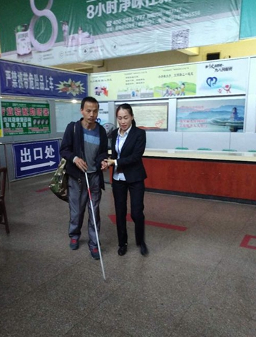 看著盲人旅客緩慢而迷茫的步伐,應(yīng)安怡準(zhǔn)備上前扶他進(jìn)站,可自己窗口前還有正在排隊(duì)購(gòu)票的旅客呢,應(yīng)安怡靈機(jī)一動(dòng),叫來(lái)了正在服務(wù)臺(tái)上班的江旭紅。
