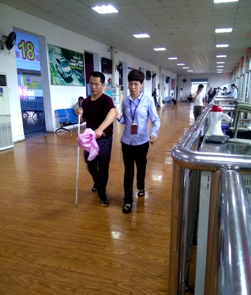 7月10日上午,一位盲人獨(dú)自來到客運(yùn)東站,準(zhǔn)備乘車去青田。盡管有盲杖的輔助,盲人的行動(dòng)還是顯得遲緩又無助。剛好經(jīng)過售票廳的行車員江雯看到了這一幕,她走上前去跟盲人旅客說明身份,問他需不需要幫助。得到盲人旅客的信任后,江雯到售票窗為盲人旅客購買好了9:50到青田的車票,之后江雯又扶著盲人旅客到候車廳的座椅上等待,由于自己的檢票臺有班次需要檢票發(fā)車,江雯就把照顧盲人旅客的事交待給了在青田班車檢票口上班的同事章莉。