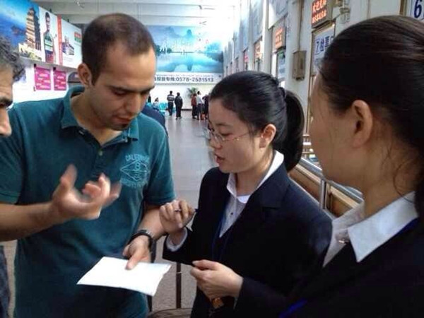 兩名外國旅客因?yàn)橛幸?,等不?:40的車。經(jīng)過葉菁的一再溝通,乘客在通完一通電話后表示自己的朋友愿意開車送他們?nèi)チx烏,就不再乘車了。充當(dāng)“翻譯”的葉菁又向宣站長轉(zhuǎn)達(dá)了他們的意思,站長當(dāng)即給他們辦理了退票手續(xù),手里握著退回金額的兩名外國旅客連連道謝,念叨著:“Thank you! Thank you!"并對葉菁的熱心幫忙豎起了大拇指。