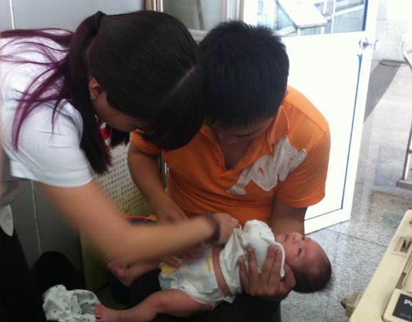 恰在這時(shí),一名年輕的“奶爸”旅客左手拉著一個(gè)行李箱,背后背著一個(gè)大包,右手還抱著一個(gè)尚在襁褓中嚶嚶哭泣的小嬰兒,滿頭大汗的來到服務(wù)臺(tái)前,小寶寶可能肚子餓了,一直在哭泣,小寶寶的媽媽又沒有隨行,只有爸爸一個(gè)人對付小家伙,實(shí)在是沒轍了,只得到服務(wù)臺(tái)求助。