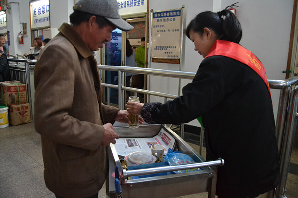 1月27日凌晨,一場不期而至的冷空氣光顧山城麗水,氣溫明顯下降。一大早,東站“流動之家”服務(wù)班的工作人員就準(zhǔn)備好熱氣騰騰的茶水,穿梭于候車室免費為旅客送上,井然有序的候車室里,彌漫著濃濃的暖意。